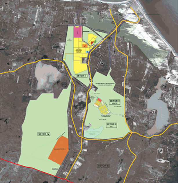 Conforme o plano diretor da companhia, a ZPE Ceará compreende quatro setores, numa área total de 6.182 hectares.